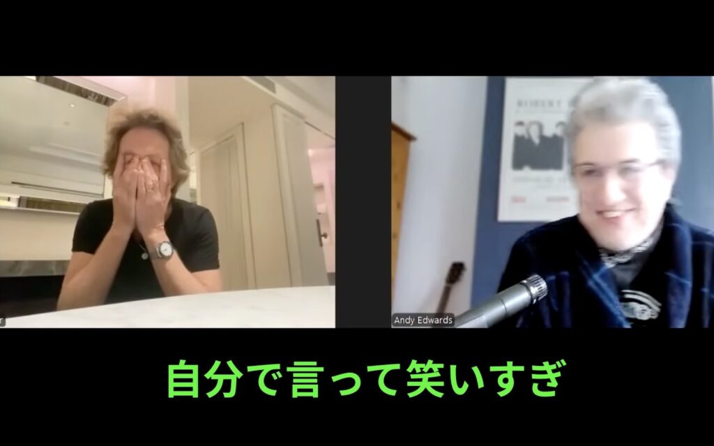 A:ああ、そうだな、君と話すのは本当に楽しいよ。だって8時間くらい話しても尽きないくらい面白い話題があるし、君の専門分野も広すぎるから——ジャズの話も音楽の話もバンドの力学の話もできるしね。もう定期的にここに戻ってくるしかないな。