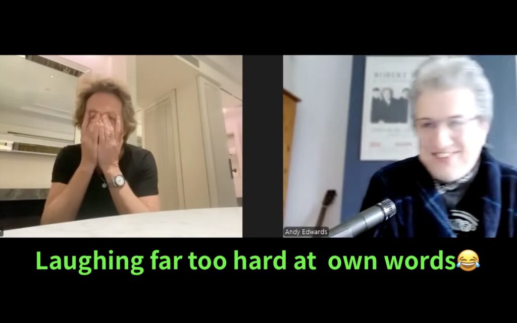 A:いや、僕は大ファンなんですよ。そして言えるのは、そうだな、88年あたりの彼はちょっとマージョリー・プループス(筆者注:イギリスの女性ジャーナリスト。英:Daily Mirror紙でコラムを書いていた)に似てたんですよ。マージョリー・プループス覚えてます? ここに写真でも出そうかな。ああいう感じだったんです。まあ、気をつけて話さないと、もしかしたら観るかもしれないから(笑)僕のユーモアの感じはわかってると思うけど。とにかく気をつけますよ。今、もう言いかけてましたよね? マージョリー・プループスの話に飛びかけてました。あれがわかるのは、ある年齢以上のイギリス人だけですよ。あなたが笑ってるのは、わかってるからですよ。他の人は「何の話だ?」って感じでしょうね。とにかく言いたいのは、その後突然彼が黒い服を着るようになって、すごくスマートでクールに見えるようになったということ。そしてあなたたちが彼を「作った」んです。だって服を与えてあげたんだから、彼はあなたに感謝すべきですよ。